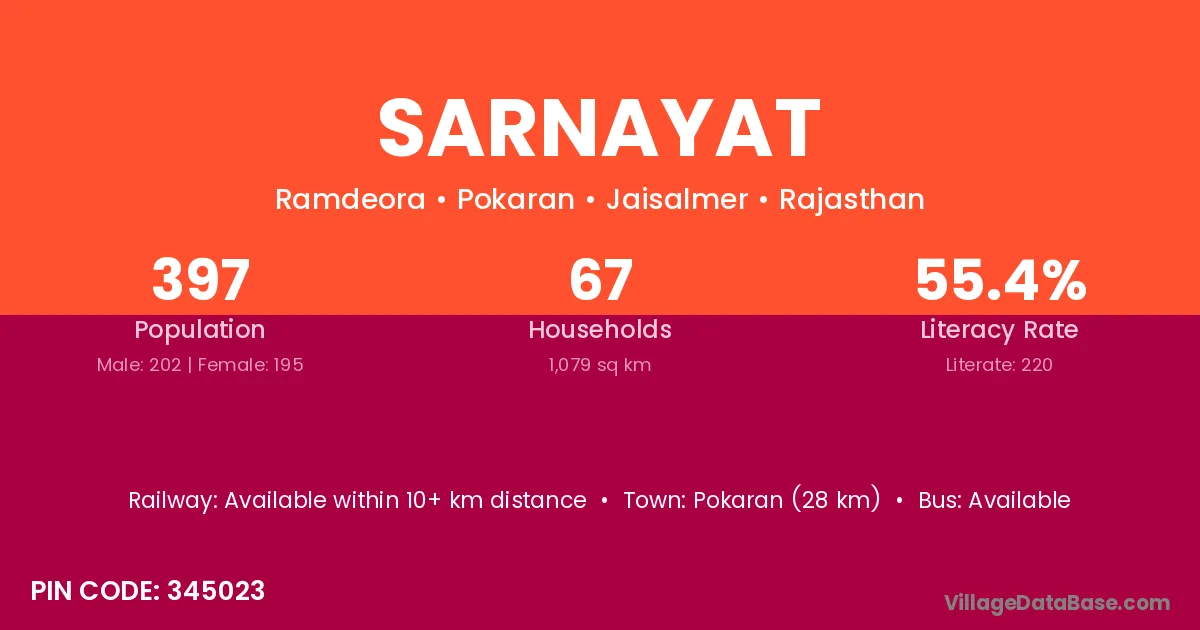 Pokaran (28 km) is the nearest town to Sarnayat village for major economic activities and is located approximately 28 km away.