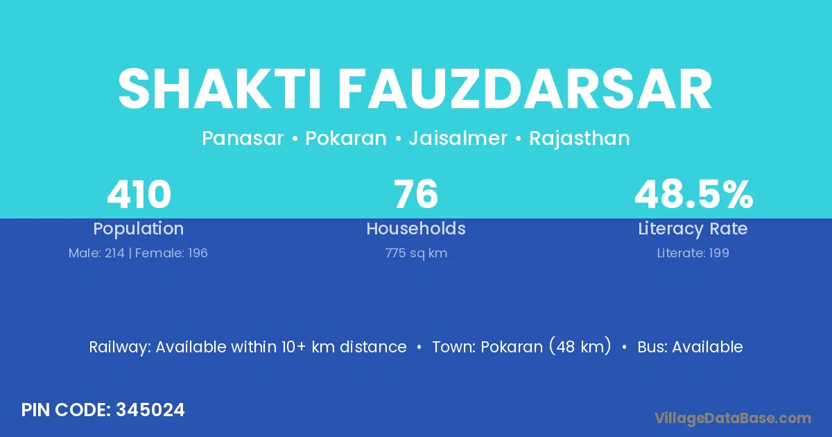 Pokaran (48 km) is the nearest town to Shakti Fauzdarsar village for major economic activities and is located approximately 48 km away.