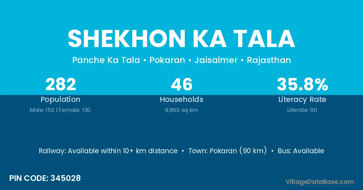 Pokaran (90 km) is the nearest town to Shekhon Ka Tala village for major economic activities and is located approximately 90 km away.