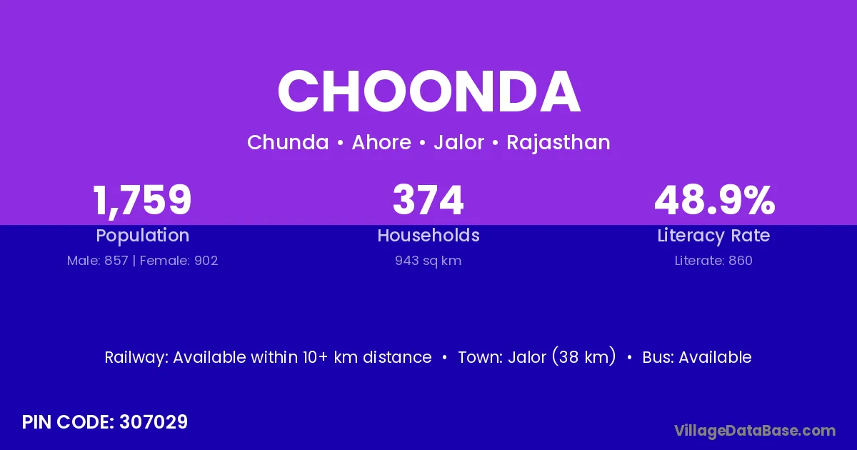 Jalor (38 km) is the nearest town to Choonda village for major economic activities and is located approximately 38 km away.