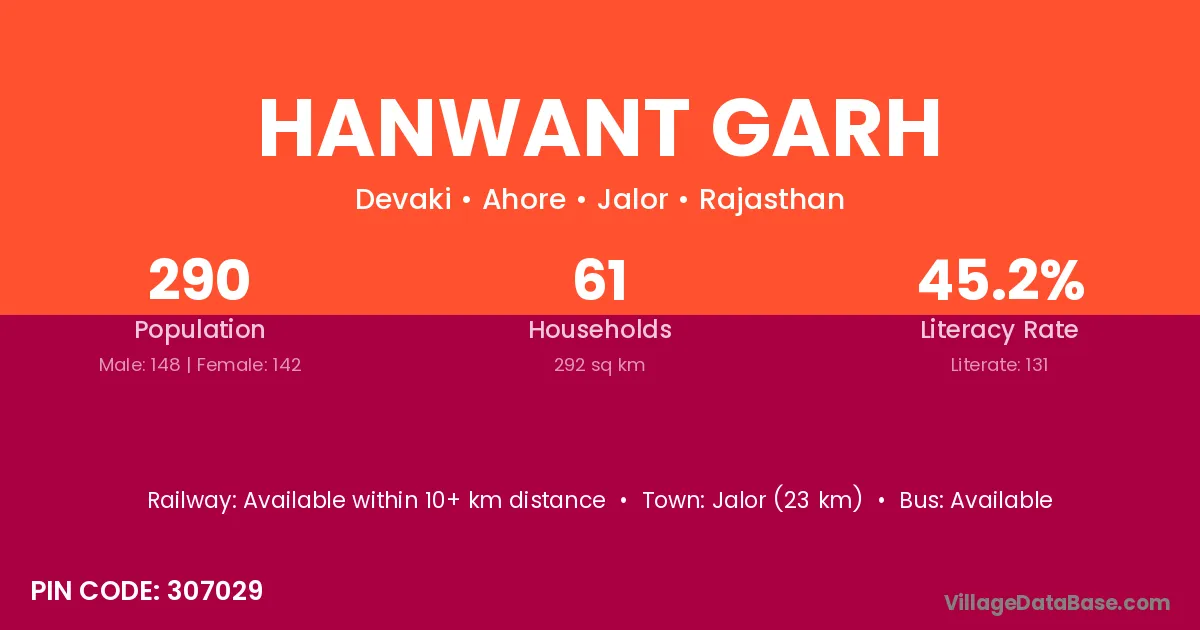 Jalor (23 km) is the nearest town to Hanwant Garh village for major economic activities and is located approximately 23 km away.