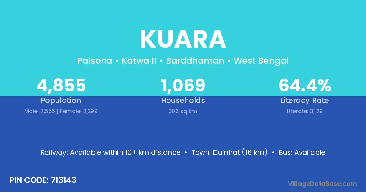 Jalor (26 km) is the nearest town to Kuara village for major economic activities and is located approximately 26 km away.