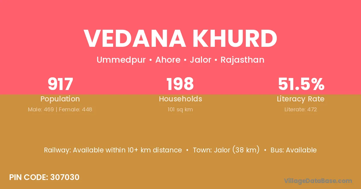 Jalor (38 km) is the nearest town to Vedana Khurd village for major economic activities and is located approximately 38 km away.