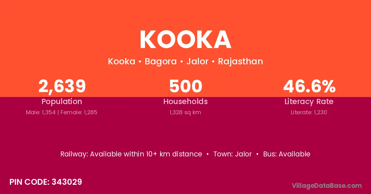 Kooka village has a total population of 2,639 people, of which 1,354 are males and 1,285 are females.