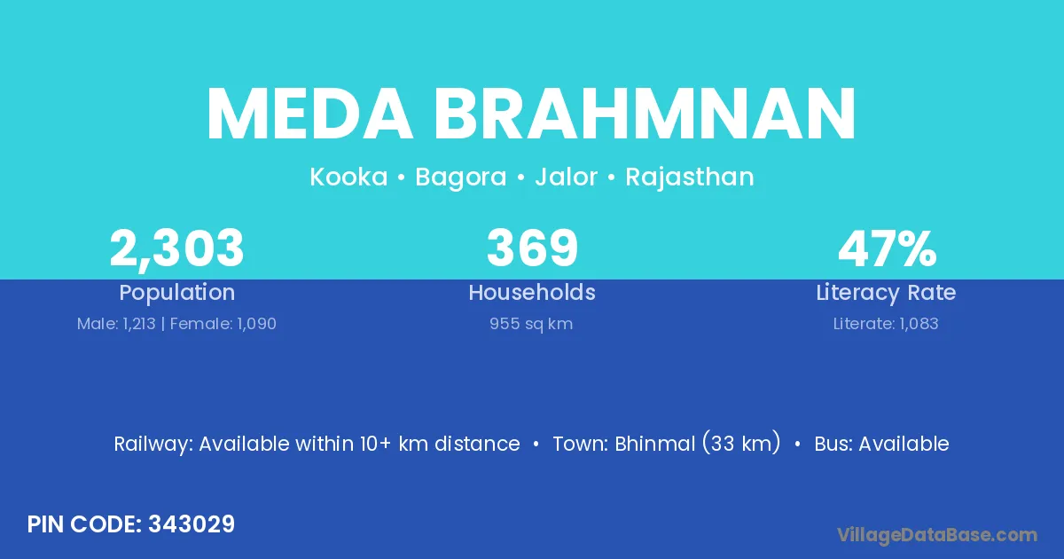 Bhinmal (33 km) is the nearest town to Meda Brahmnan village for major economic activities and is located approximately 33 km away.
