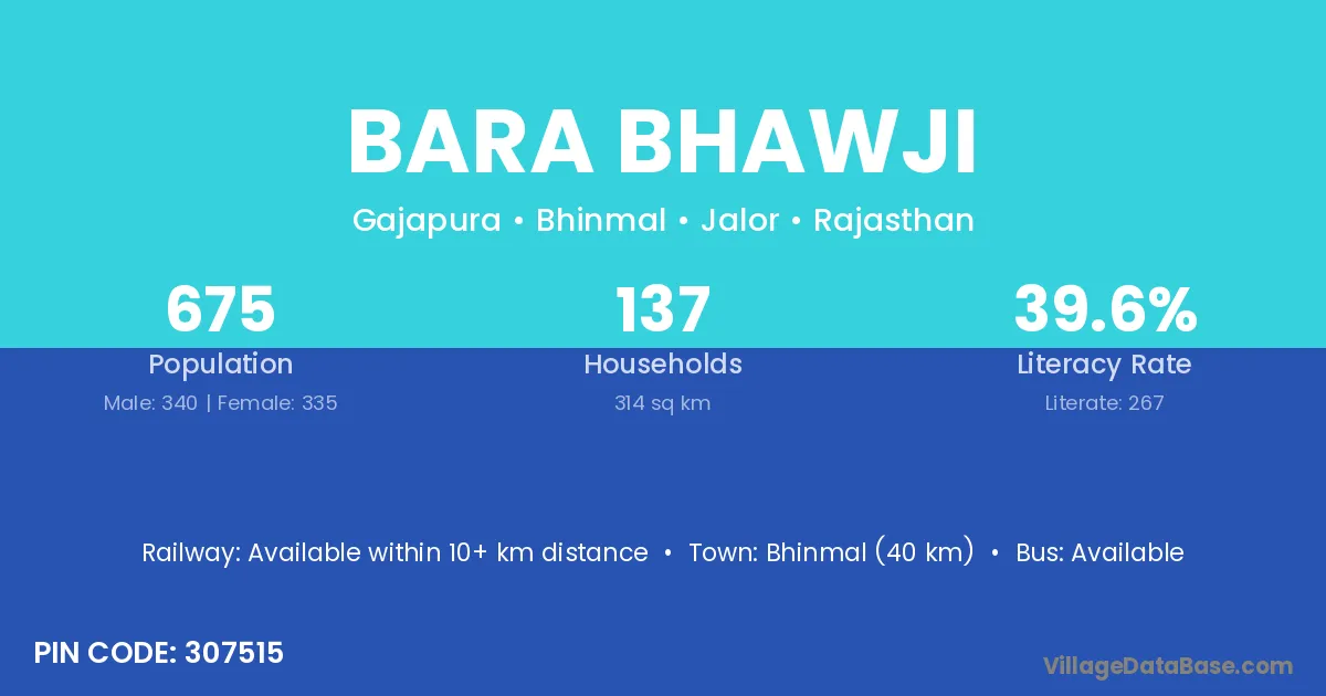 Bhinmal (40 km) is the nearest town to Bara Bhawji village for major economic activities and is located approximately 40 km away.