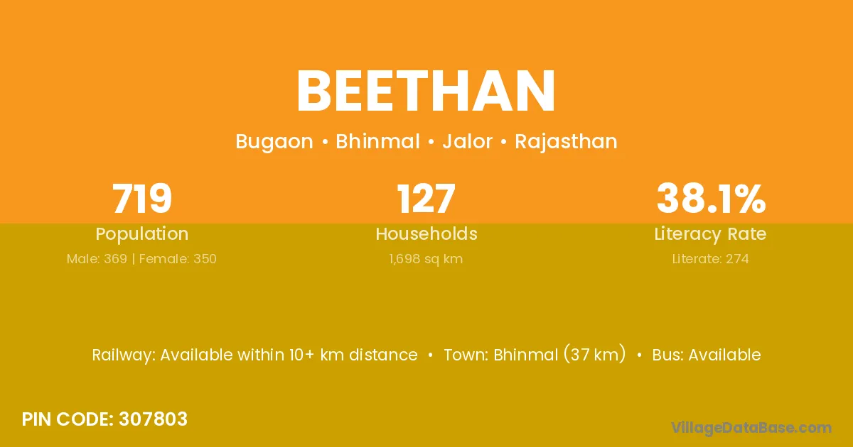 Bhinmal (37 km) is the nearest town to Beethan village for major economic activities and is located approximately 37 km away.