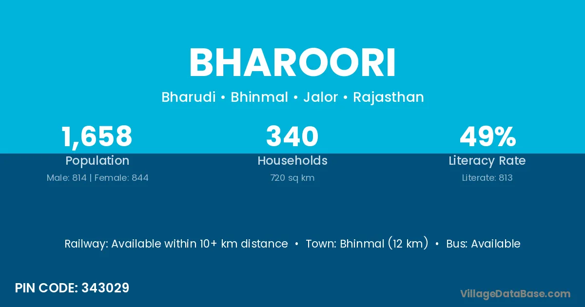 Bhinmal (12 km) is the nearest town to Bharoori village for major economic activities and is located approximately 12 km away.