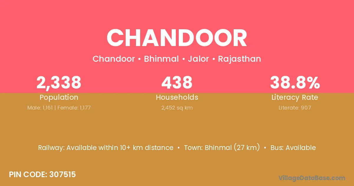 Bhinmal (27 km) is the nearest town to Chandoor village for major economic activities and is located approximately 27 km away.