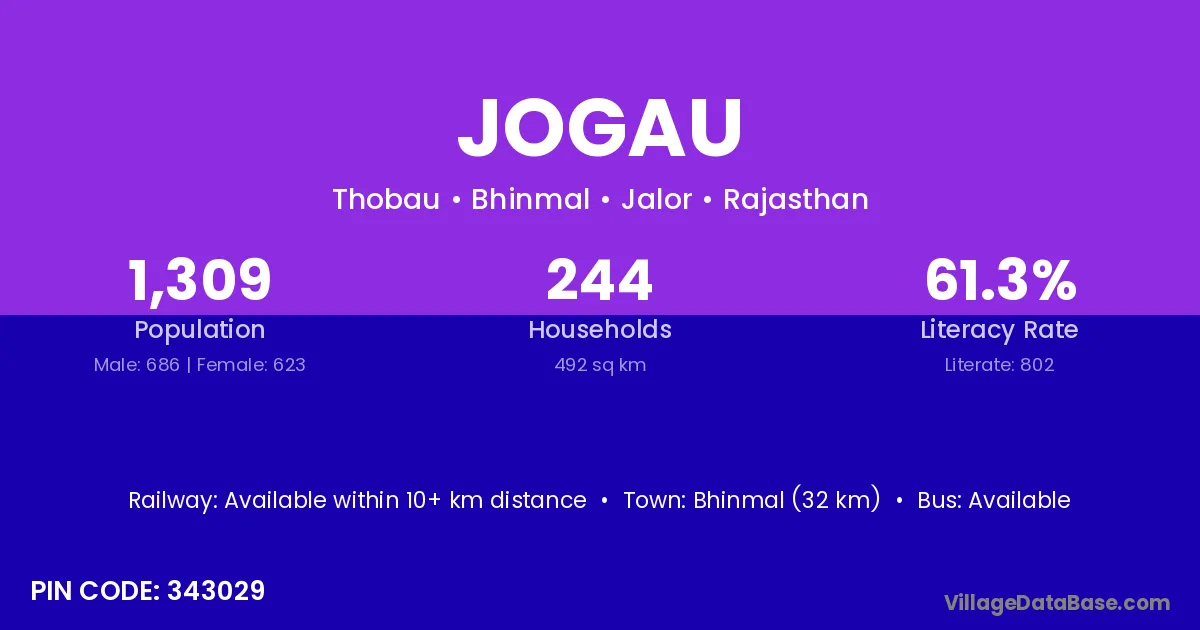 Bhinmal (32 km) is the nearest town to Jogau village for major economic activities and is located approximately 32 km away.