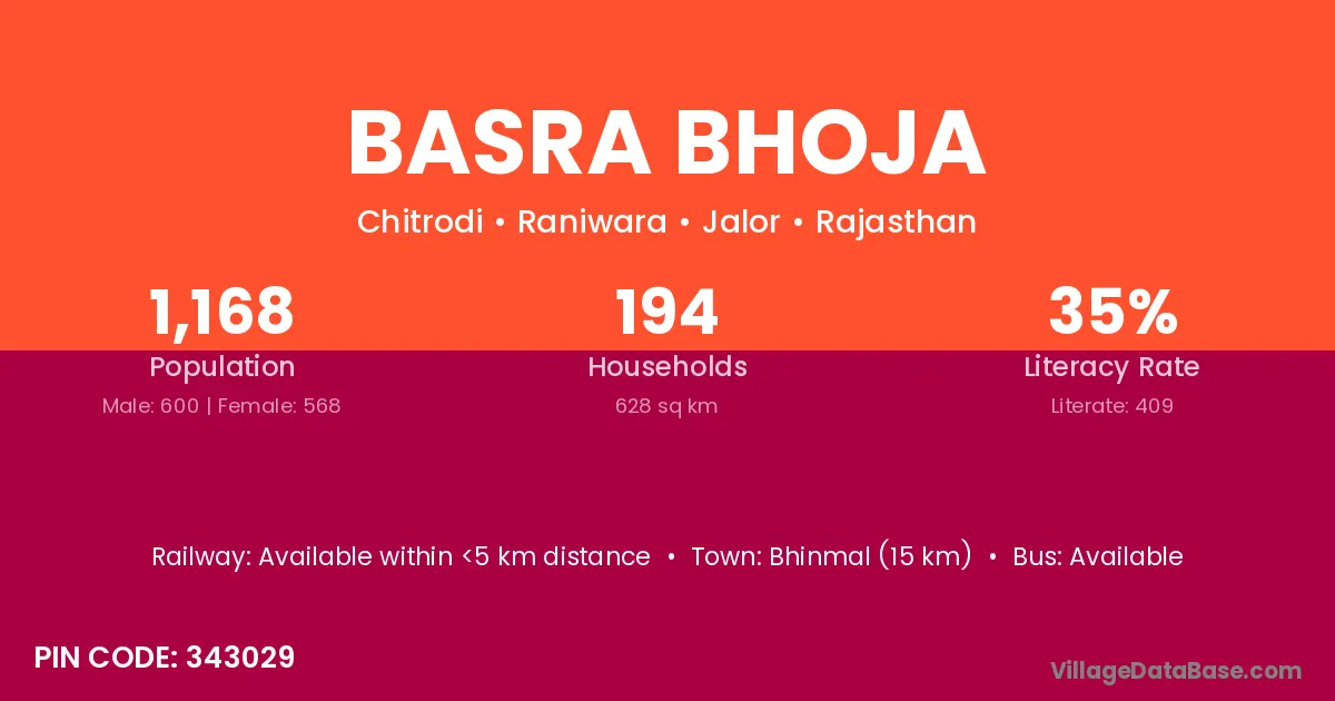 Bhinmal (15 km) is the nearest town to Basra Bhoja village for major economic activities and is located approximately 15 km away.