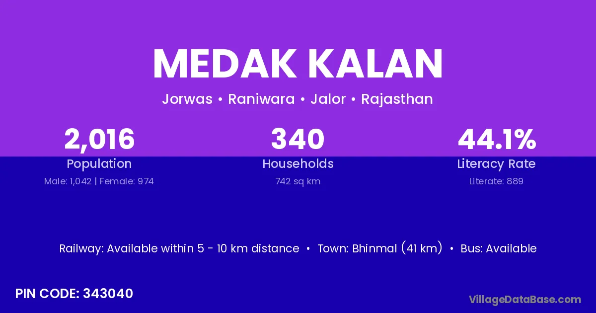 Bhinmal (41 km) is the nearest town to Medak Kalan village for major economic activities and is located approximately 41 km away.