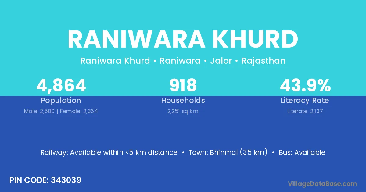 Bhinmal (35 km) is the nearest town to Raniwara Khurd village for major economic activities and is located approximately 35 km away.