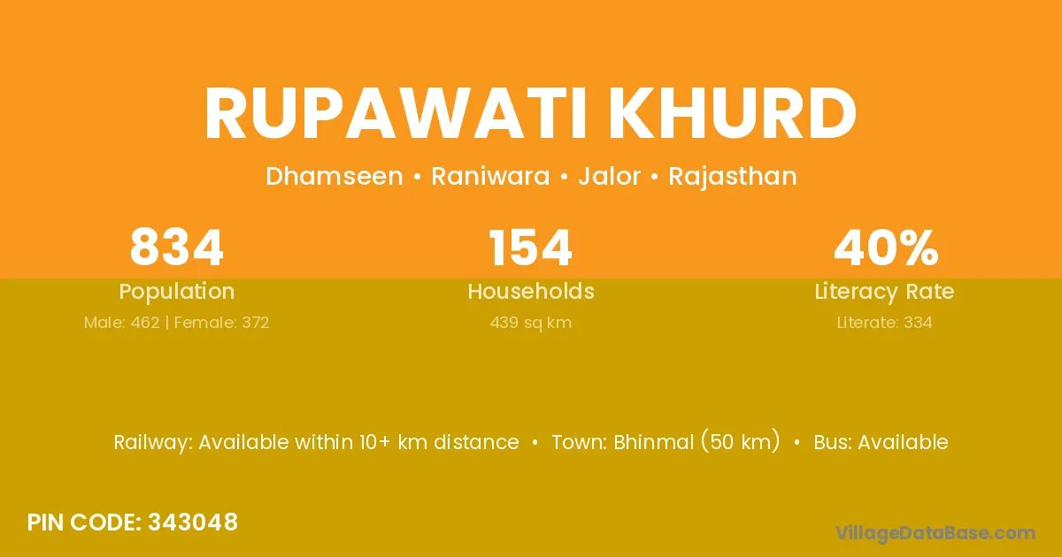 Bhinmal (50 km) is the nearest town to Rupawati Khurd village for major economic activities and is located approximately 50 km away.