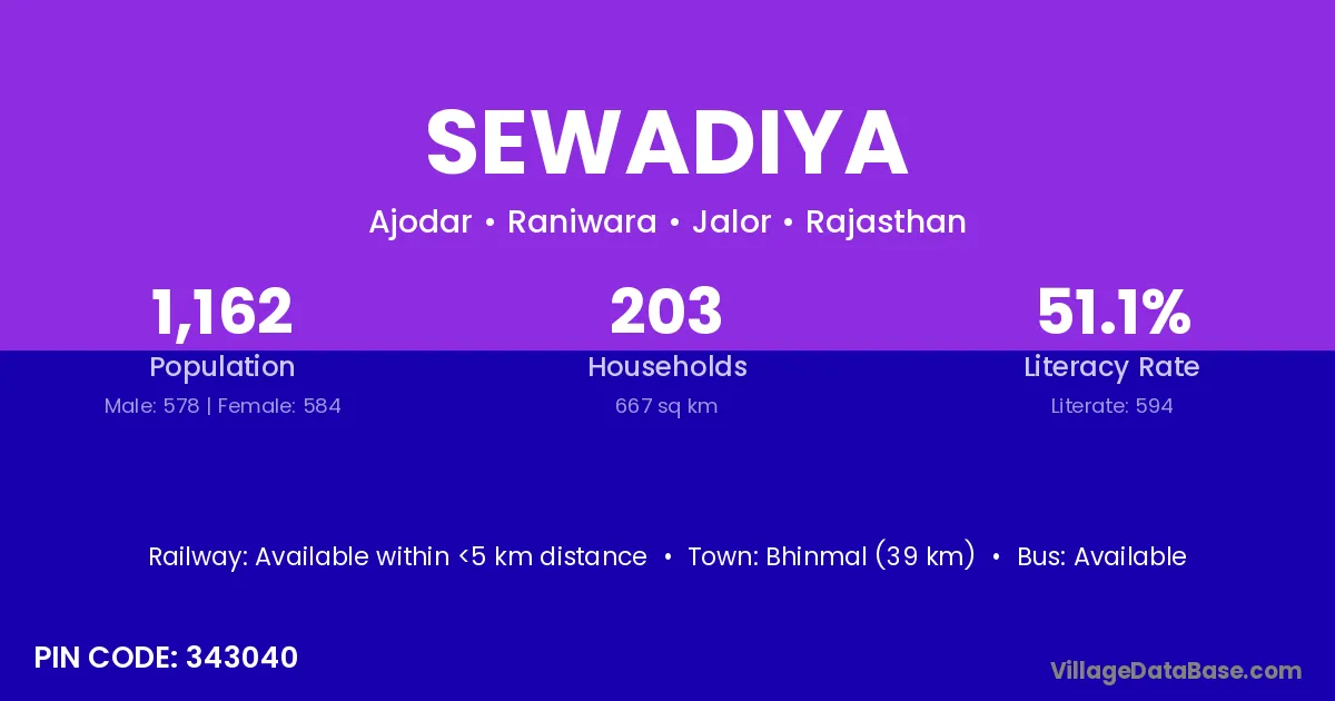 Bhinmal (39 km) is the nearest town to Sewadiya village for major economic activities and is located approximately 39 km away.