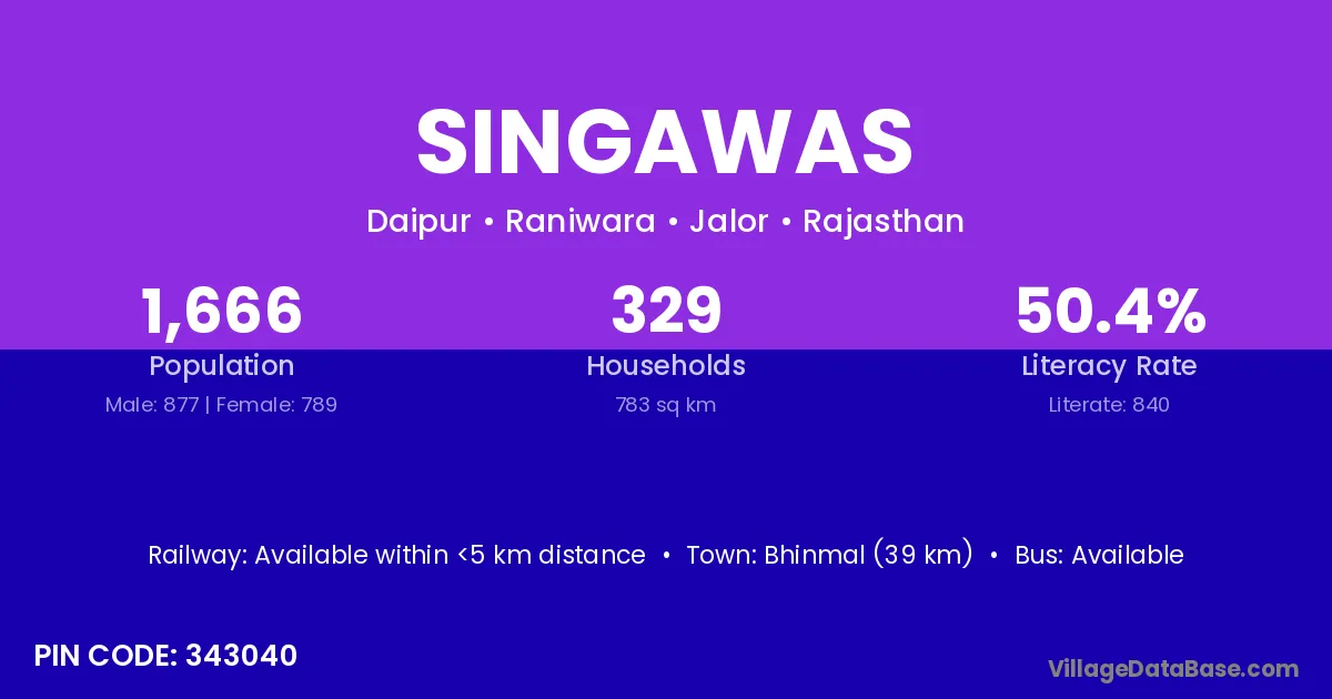 Bhinmal (39 km) is the nearest town to Singawas village for major economic activities and is located approximately 39 km away.