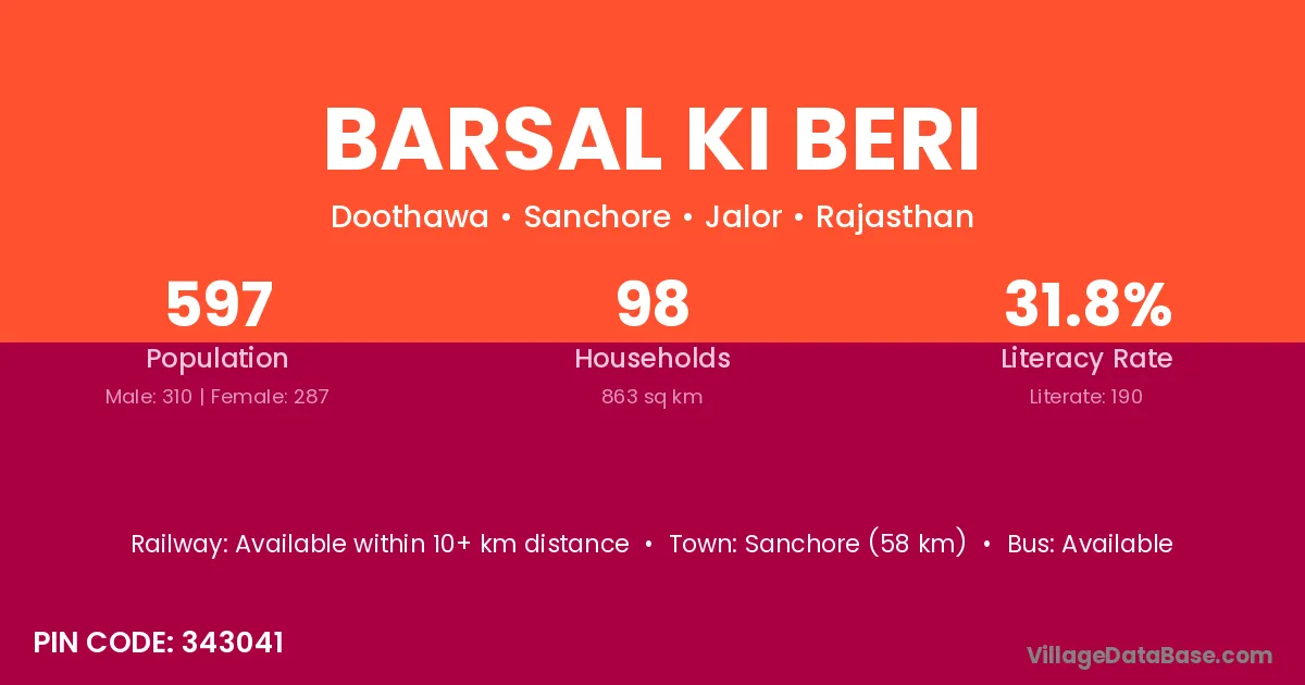Sanchore (58 km) is the nearest town to Barsal Ki Beri village for major economic activities and is located approximately 58 km away.
