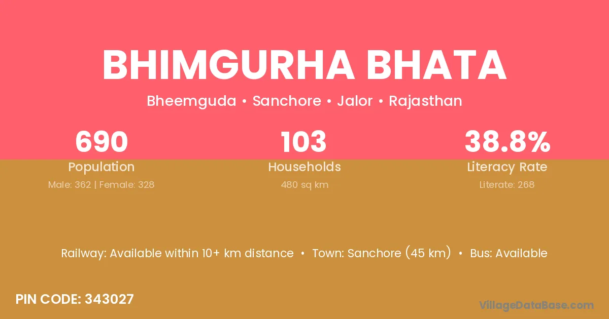 Sanchore (45 km) is the nearest town to Bhimgurha Bhata village for major economic activities and is located approximately 45 km away.