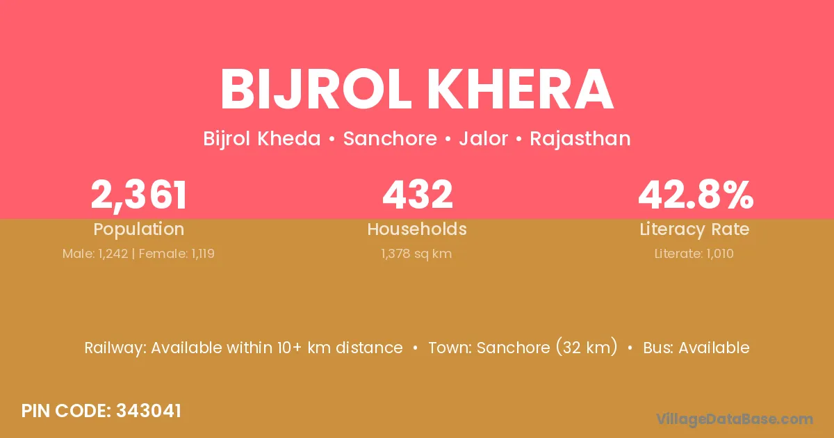Sanchore (32 km) is the nearest town to Bijrol Khera village for major economic activities and is located approximately 32 km away.