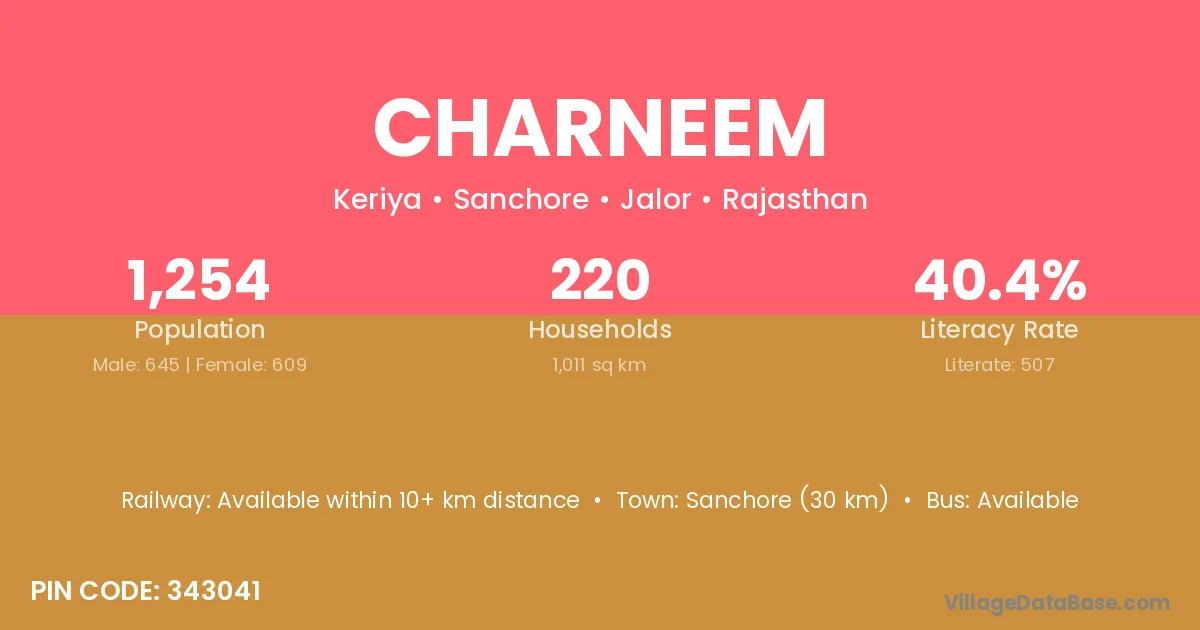 Sanchore (30 km) is the nearest town to Charneem village for major economic activities and is located approximately 30 km away.