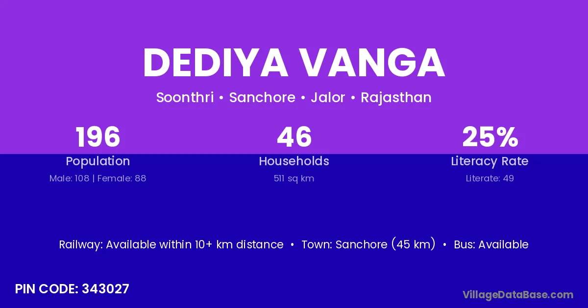 Sanchore (45 km) is the nearest town to Dediya Vanga village for major economic activities and is located approximately 45 km away.