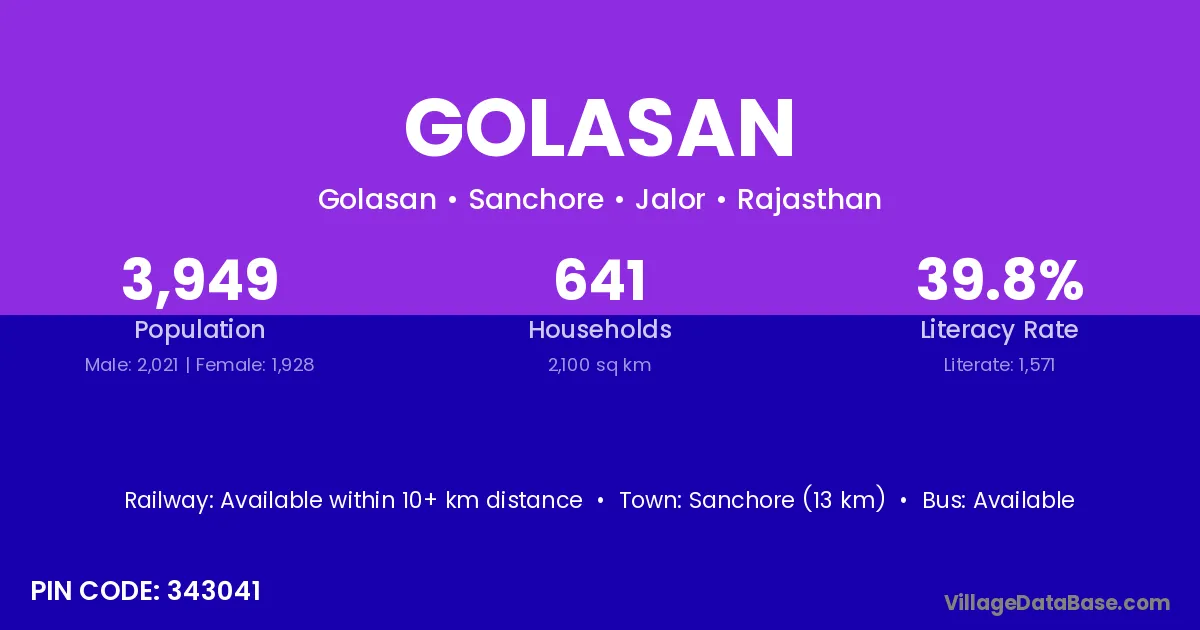 Sanchore (13 km) is the nearest town to Golasan village for major economic activities and is located approximately 13 km away.