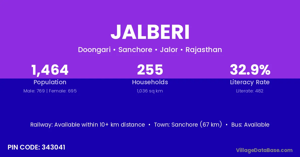 Sanchore (67 km) is the nearest town to Jalberi village for major economic activities and is located approximately 67 km away.