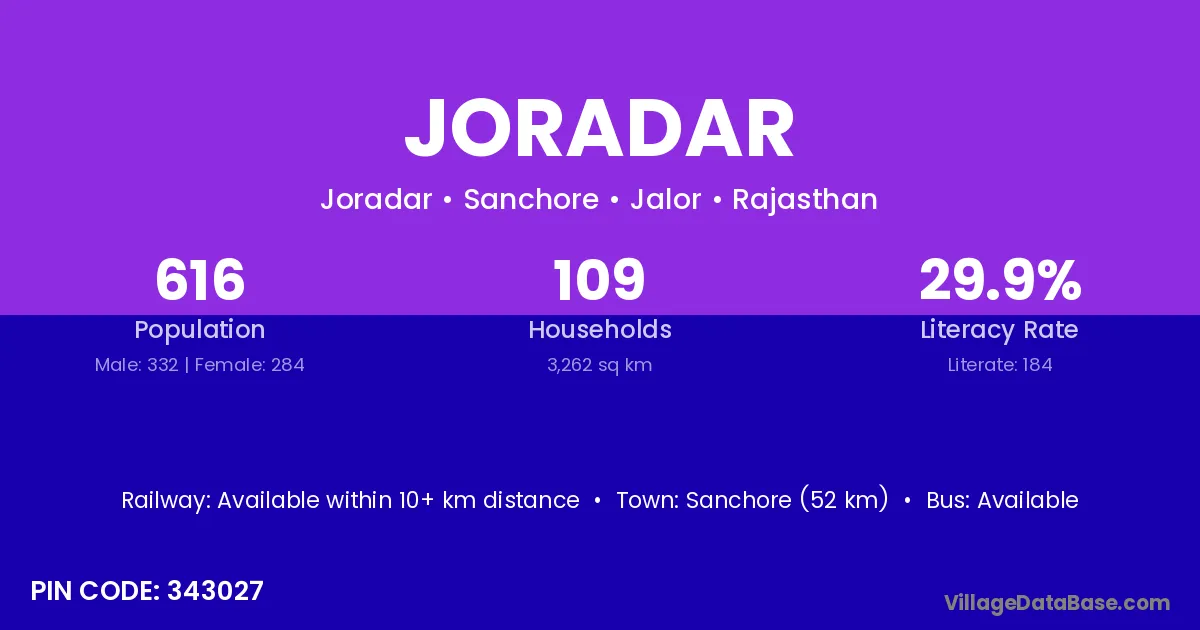 Sanchore (52 km) is the nearest town to Joradar village for major economic activities and is located approximately 52 km away.