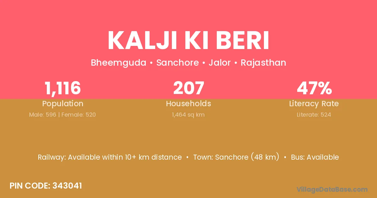 Kalji Ki Beri village has a total population of 1,116 people, of which 596 are males and 520 are females.
