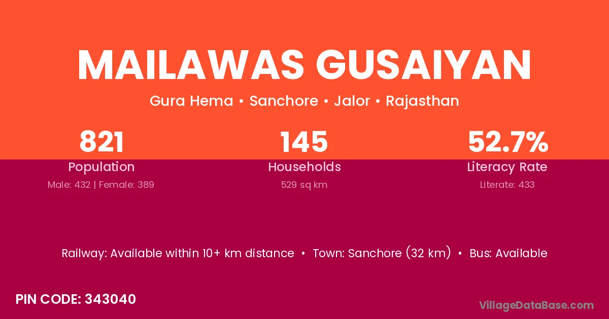 Sanchore (32 km) is the nearest town to Mailawas Gusaiyan village for major economic activities and is located approximately 32 km away.