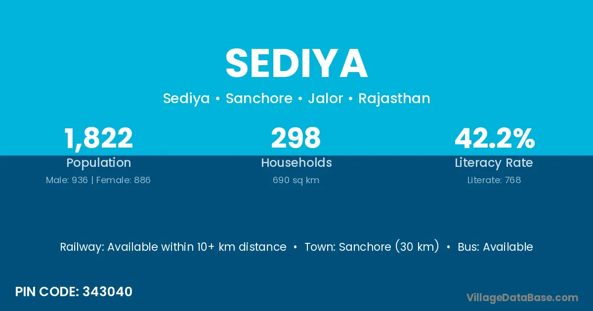Sanchore (30 km) is the nearest town to Sediya village for major economic activities and is located approximately 30 km away.