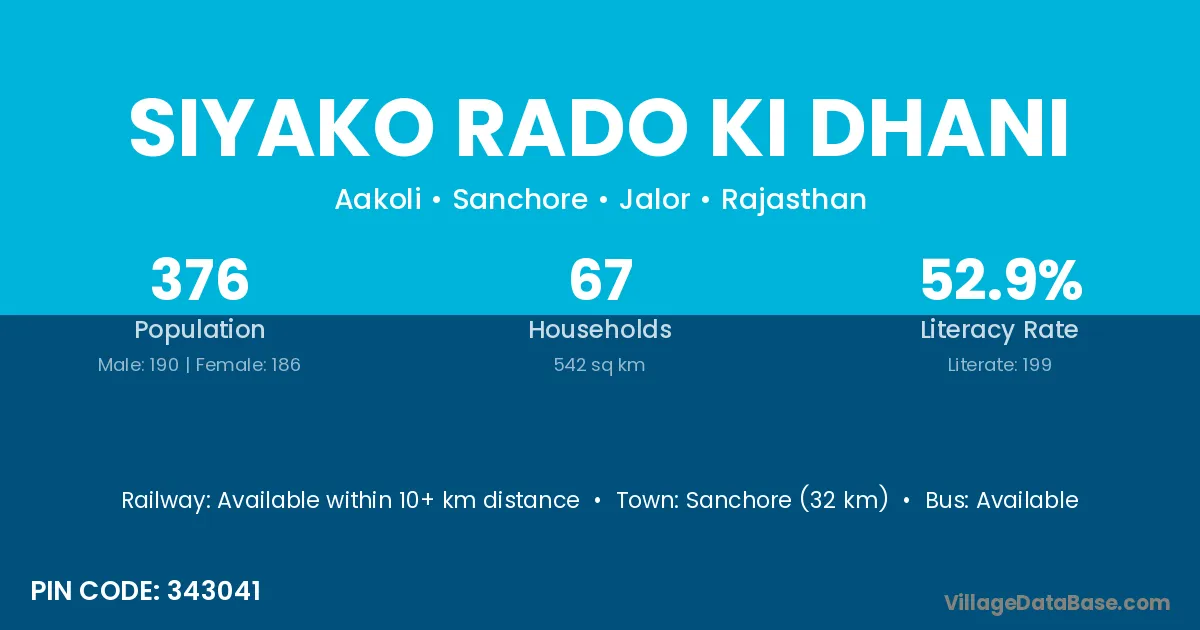 Siyako Rado Ki Dhani village has a total population of 376 people, of which 190 are males and 186 are females.