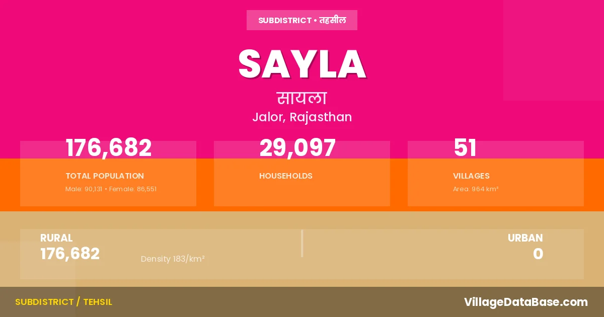 According to the 2011 census The total area of Sayla Tehsil is 964 km², with a population of 176682 people. The population density is 183 inhabitants per square kilometre, and there are approximately 29097 houses in the sub district.