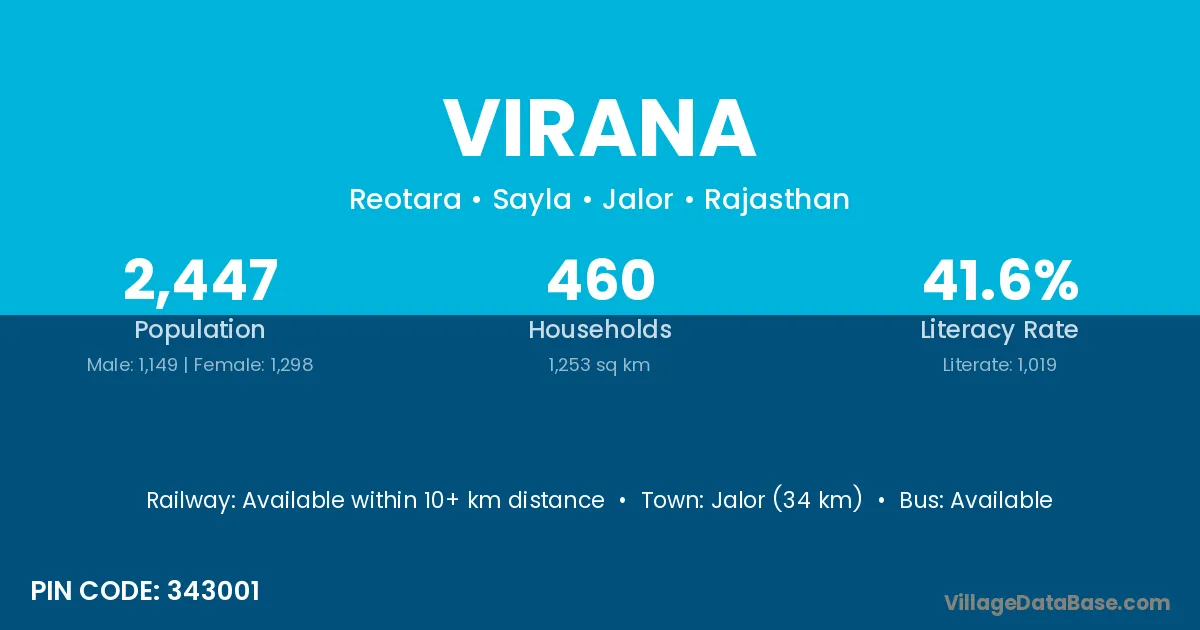 Jalor (34 km) is the nearest town to Virana village for major economic activities and is located approximately 34 km away.