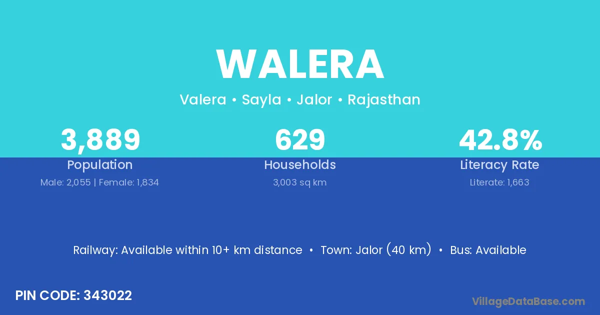 Jalor (40 km) is the nearest town to Walera village for major economic activities and is located approximately 40 km away.