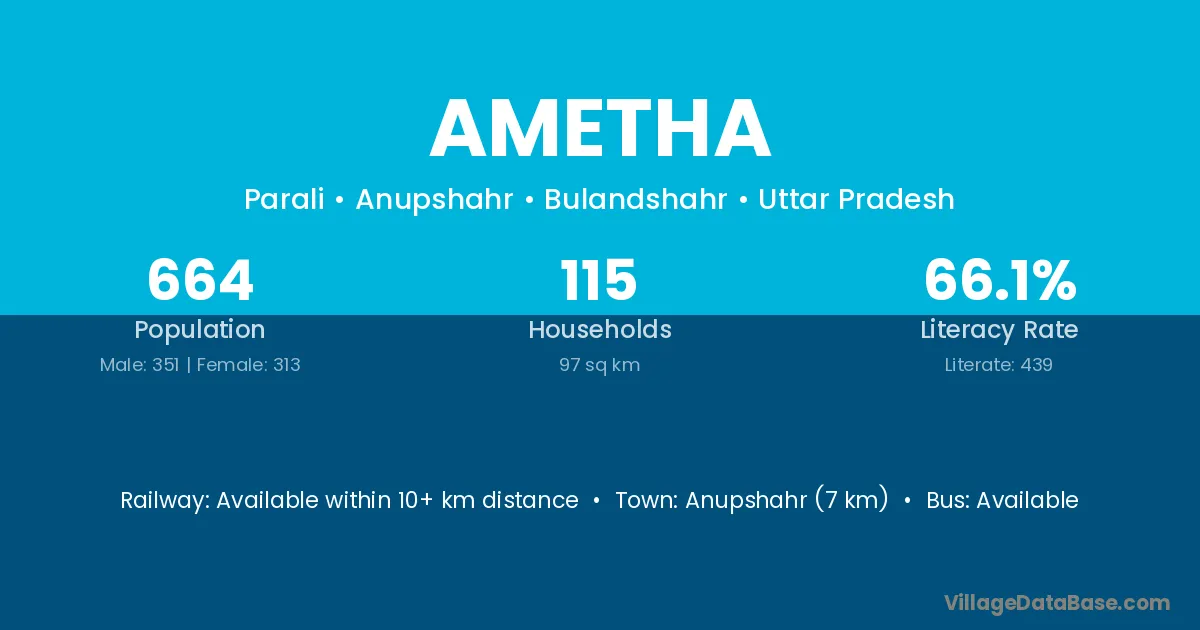 The literacy rate of Ametha village is 41.44%. Male literacy stands at 52.35% and female literacy at 30.07%.