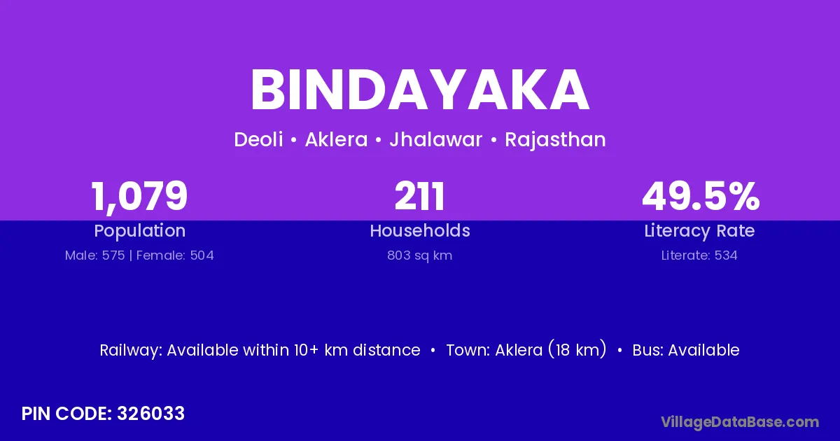 Aklera (18 km) is the nearest town to Bindayaka village for major economic activities and is located approximately 18 km away.