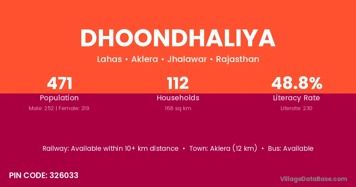 Aklera (12 km) is the nearest town to Dhoondhaliya village for major economic activities and is located approximately 12 km away.