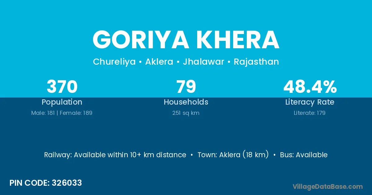 Aklera (18 km) is the nearest town to Goriya Khera village for major economic activities and is located approximately 18 km away.