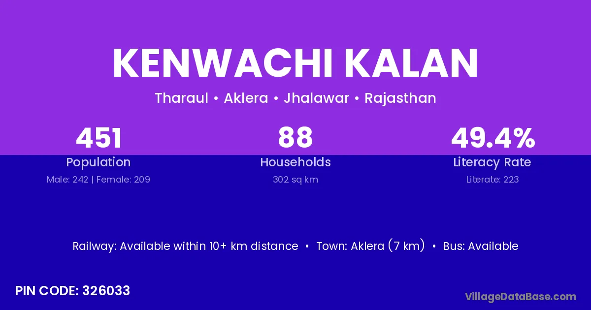 Aklera (7 km) is the nearest town to Kenwachi Kalan village for major economic activities and is located approximately 7 km away.