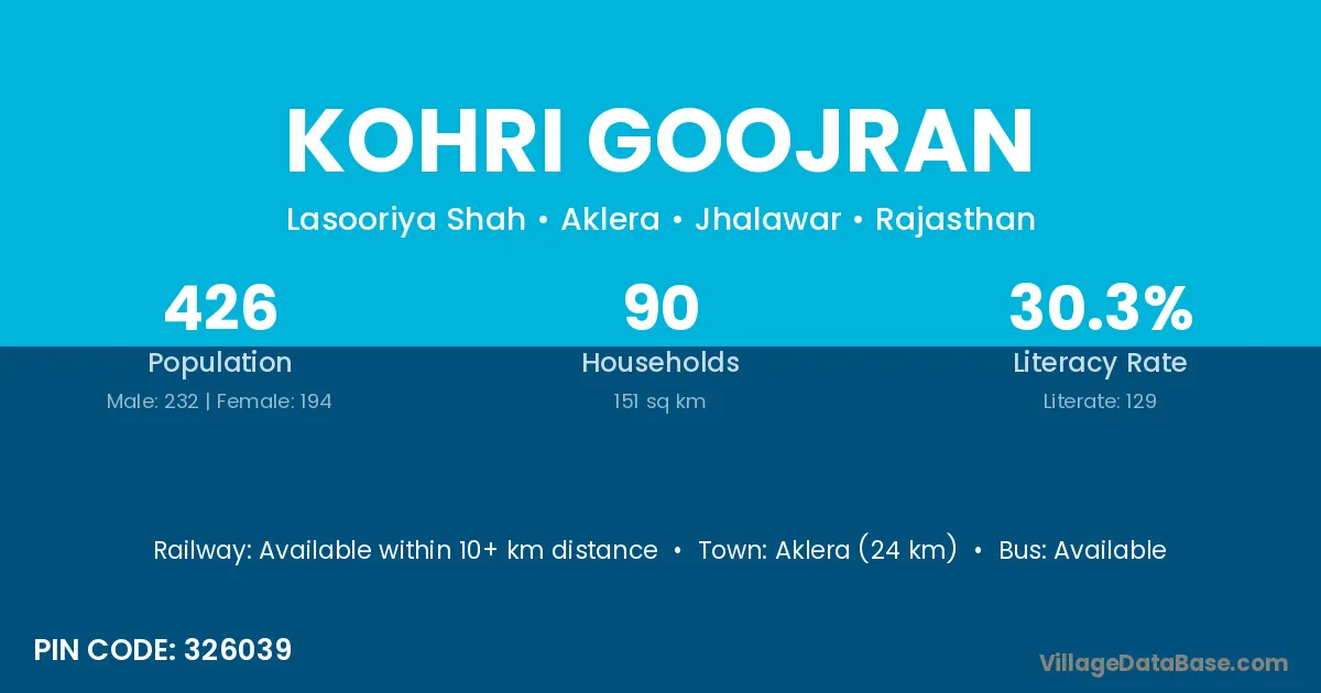 Aklera (24 km) is the nearest town to Kohri Goojran village for major economic activities and is located approximately 24 km away.