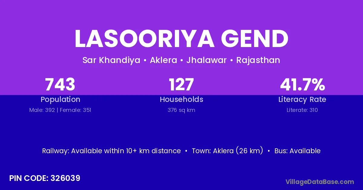Aklera (26 km) is the nearest town to Lasooriya Gend village for major economic activities and is located approximately 26 km away.