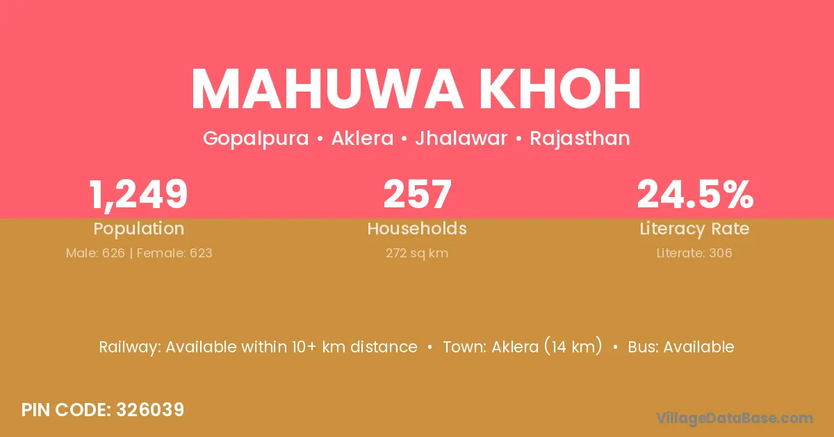 Mahuwa Khoh village has a total population of 1,249 people, of which 626 are males and 623 are females.