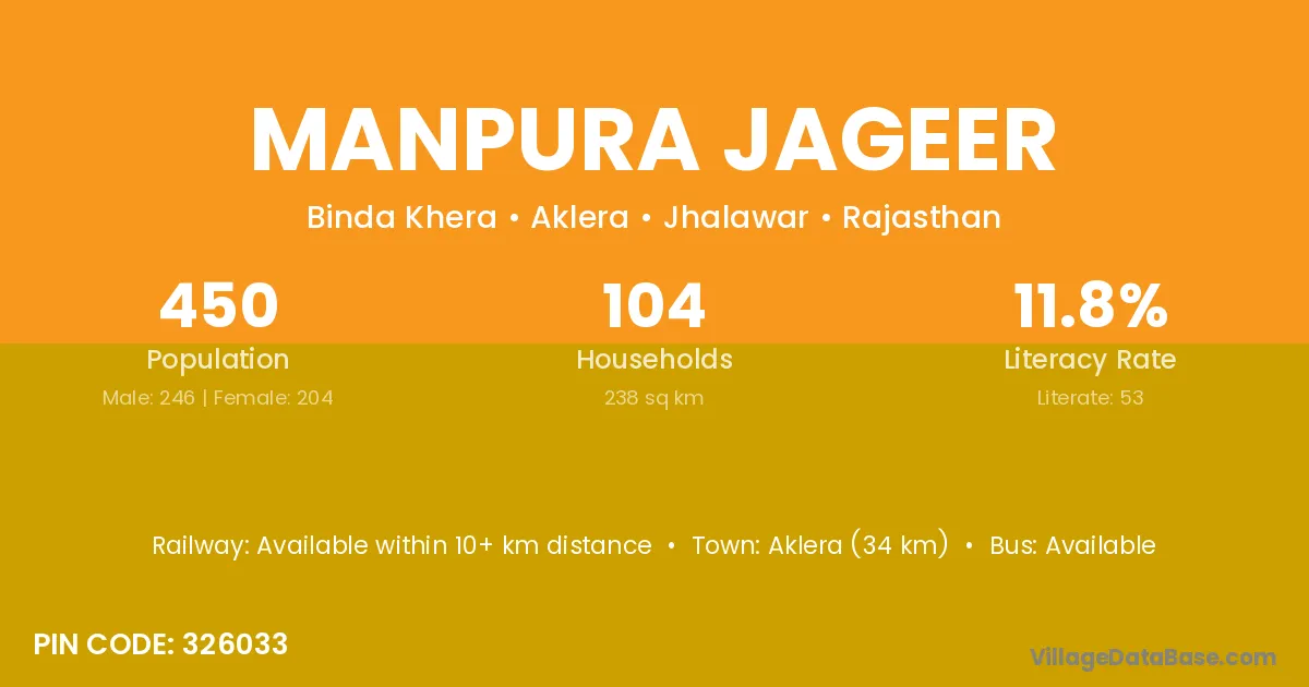 Aklera (34 km) is the nearest town to Manpura Jageer village for major economic activities and is located approximately 34 km away.