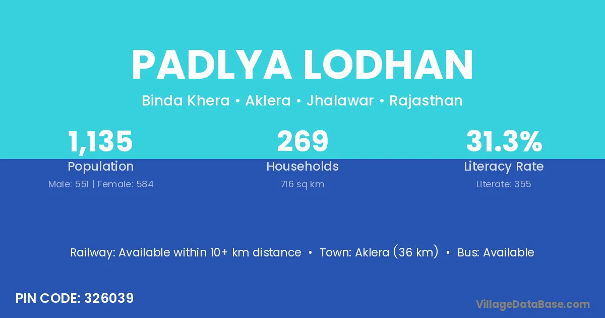 Aklera (36 km) is the nearest town to Padlya Lodhan village for major economic activities and is located approximately 36 km away.