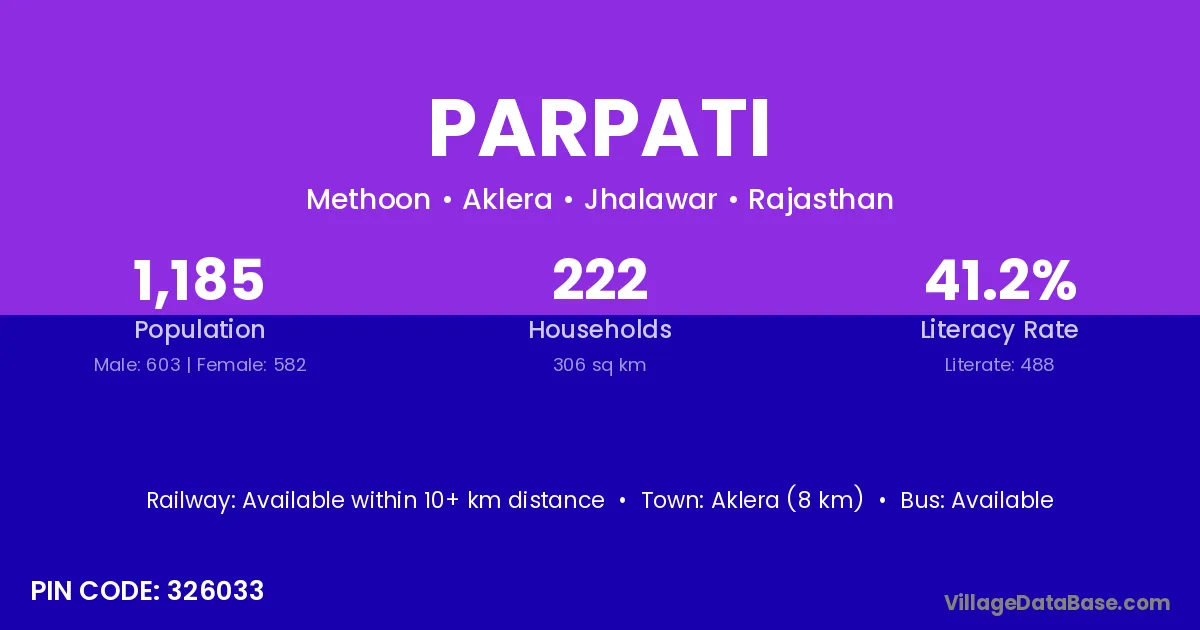 Aklera (8 km) is the nearest town to Parpati village for major economic activities and is located approximately 8 km away.
