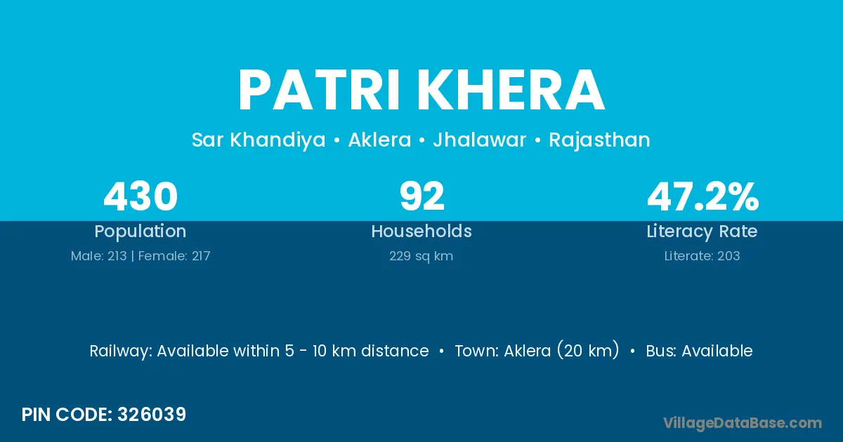Aklera (20 km) is the nearest town to Patri Khera village for major economic activities and is located approximately 20 km away.