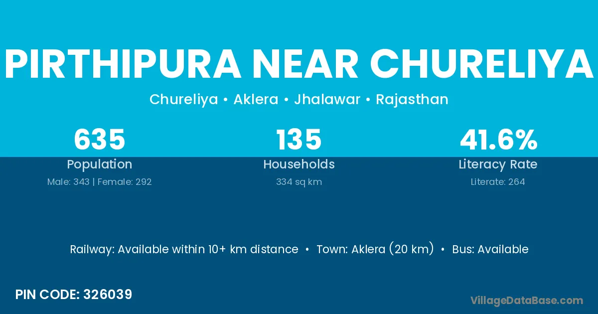 Aklera (20 km) is the nearest town to Pirthipura Near Chureliya village for major economic activities and is located approximately 20 km away.