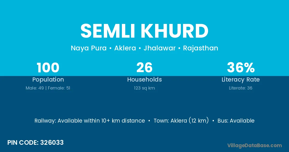 Aklera (12 km) is the nearest town to Semli Khurd village for major economic activities and is located approximately 12 km away.