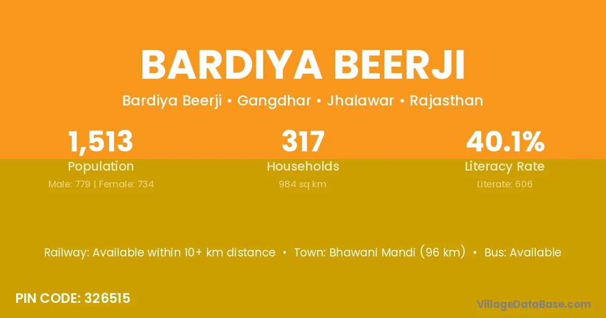 Bhawani Mandi (96 km) is the nearest town to Bardiya Beerji village for major economic activities and is located approximately 96 km away.